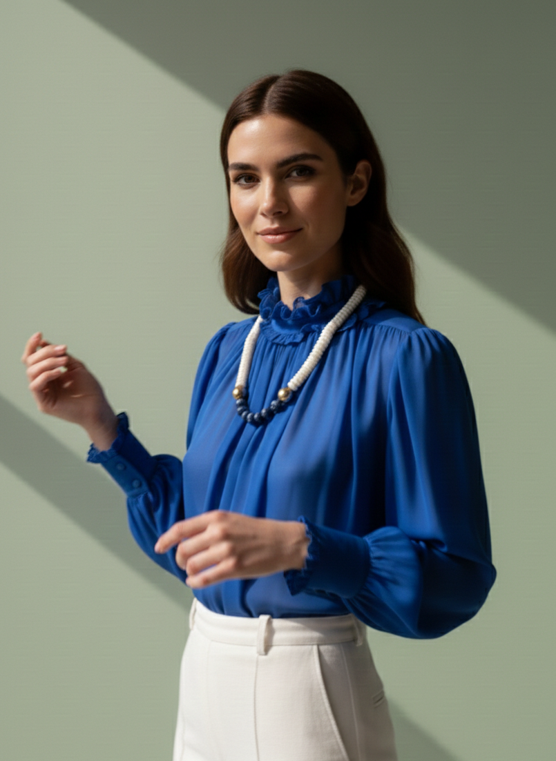 Metal ara parçalar ve Mala boncuklarıyla benzersiz bir tasarıma sahip ilk imza parçamızı piyasaya sürdük. Bu model, her sezon yeni malzemelerle geliştirilerek en çok satan ürünümüz oldu.