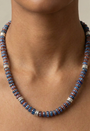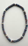 A Bini classic from past summer, the chevron Bini necklace with no buckle this time has blue chevron beads and silver plated brass spacers.