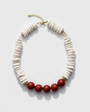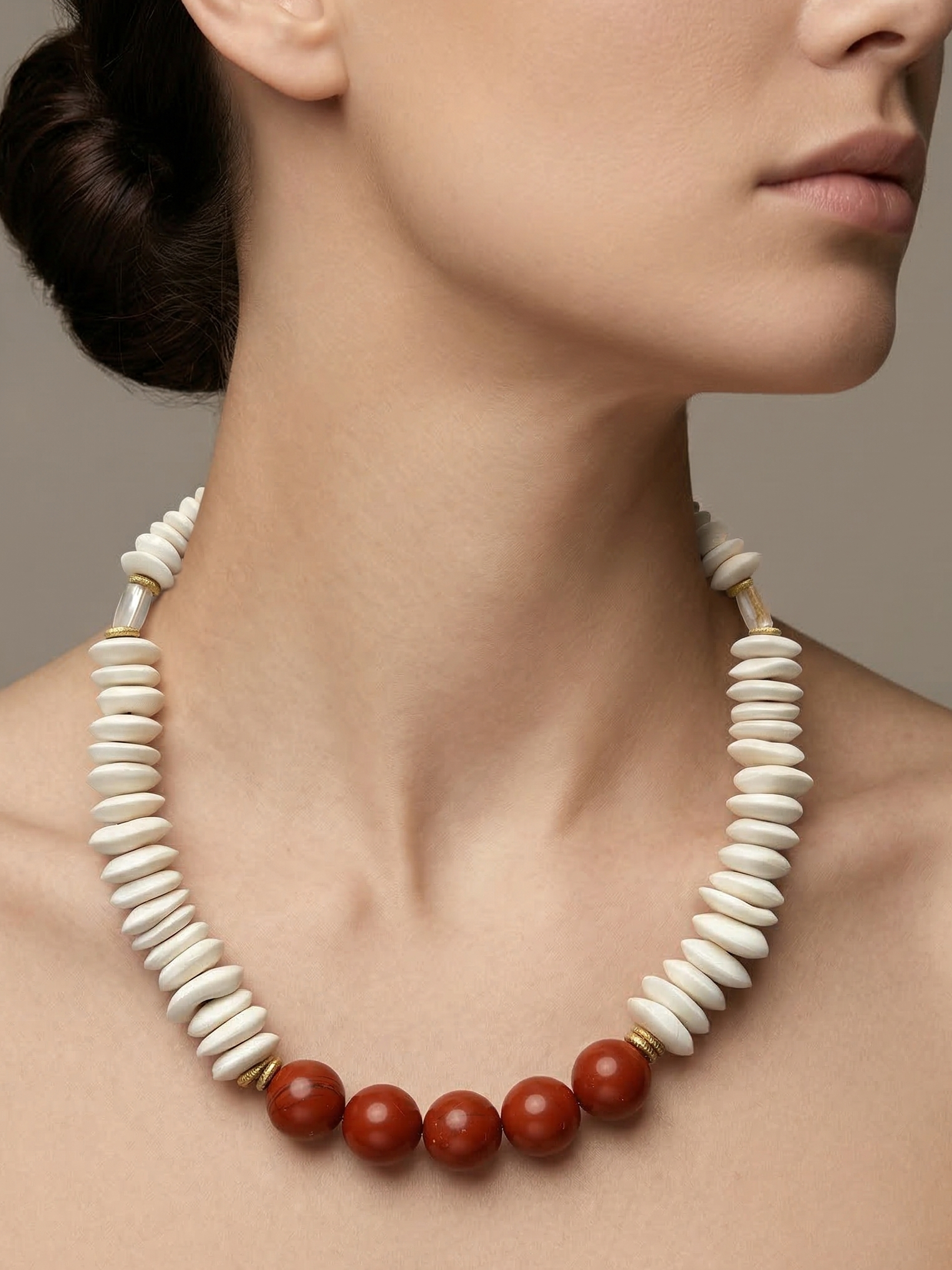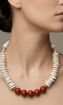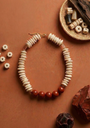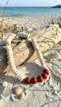 Our classic style, the Tortuga, now with white bone beads and red jaspers. Has the warmth of the sun and the freshness of the white sands.