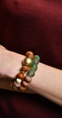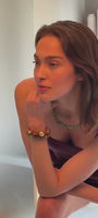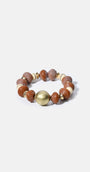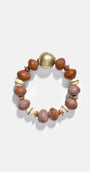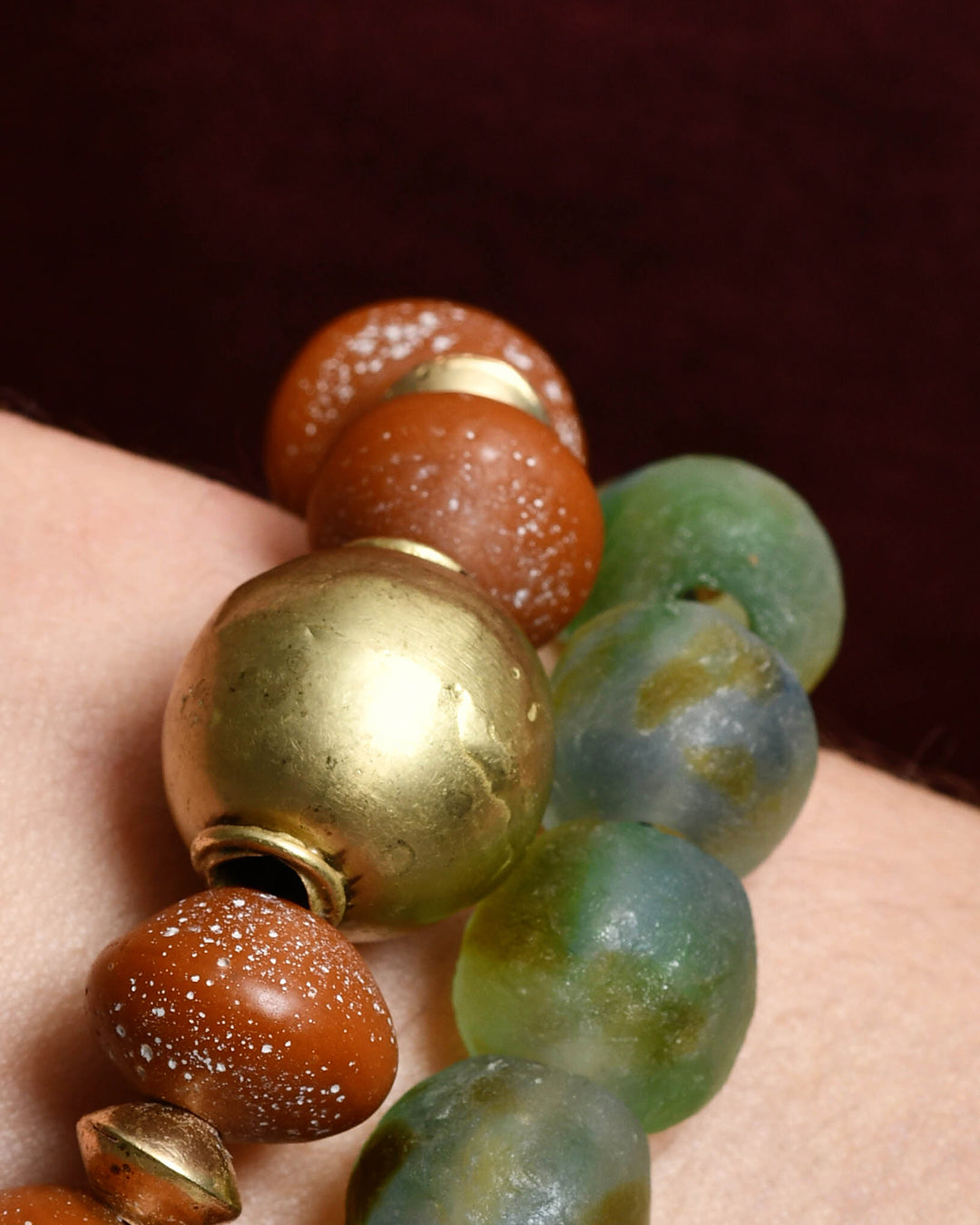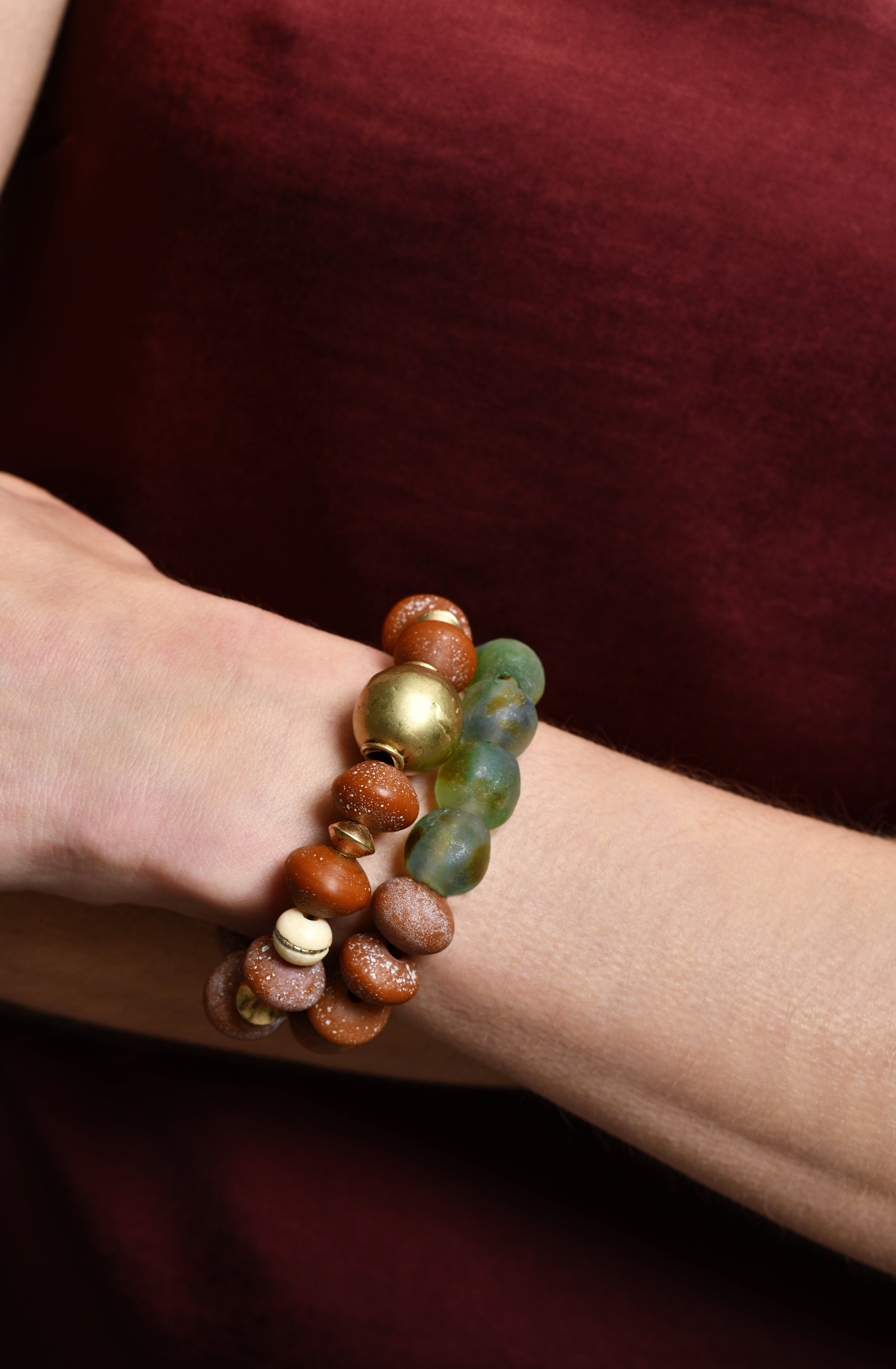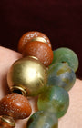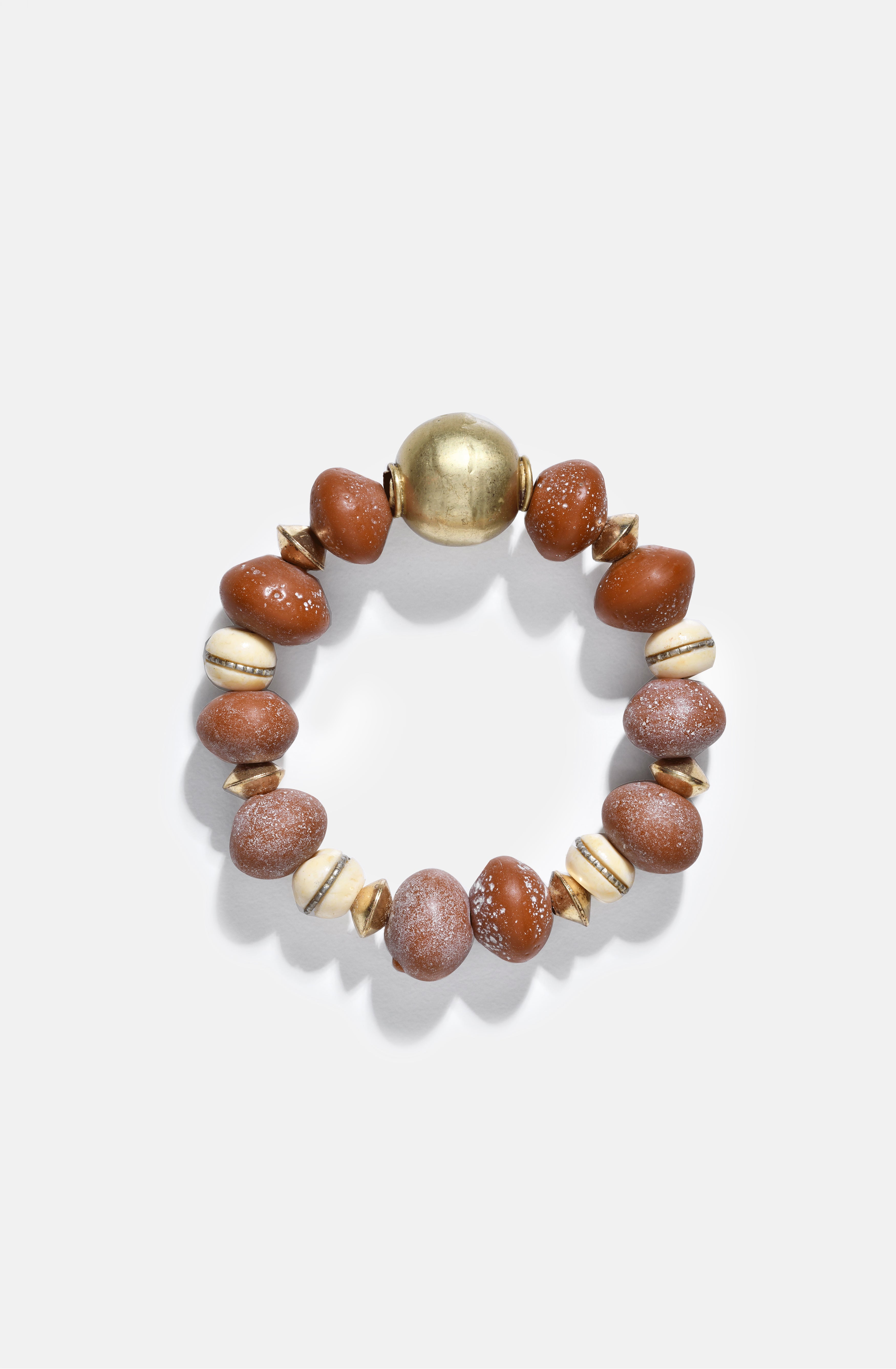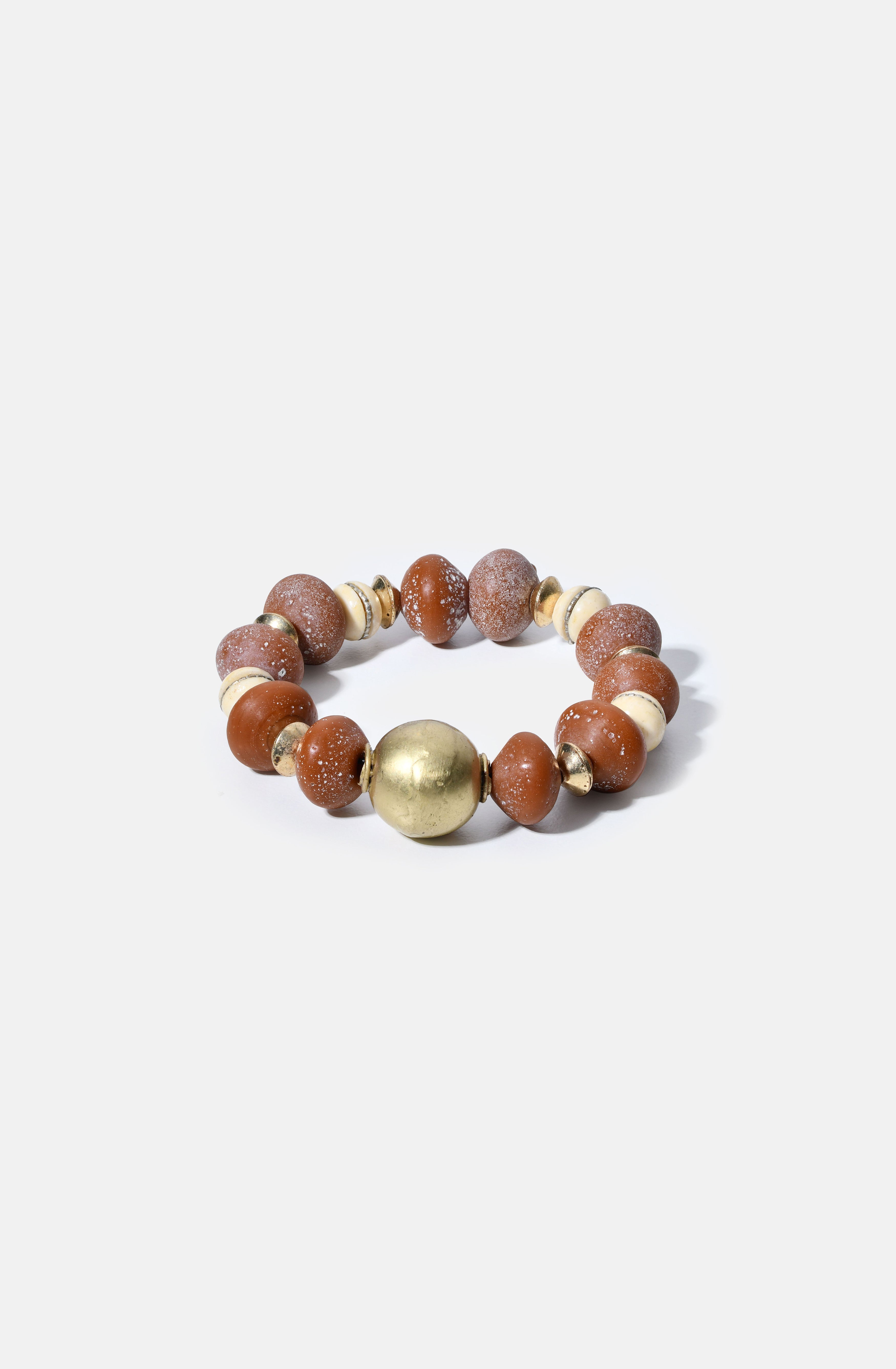 Designers favorite; caramel recycled glass beads, Nepali mala bone beads and an Ethiopian brass hero bead at the center. Must have for fall.