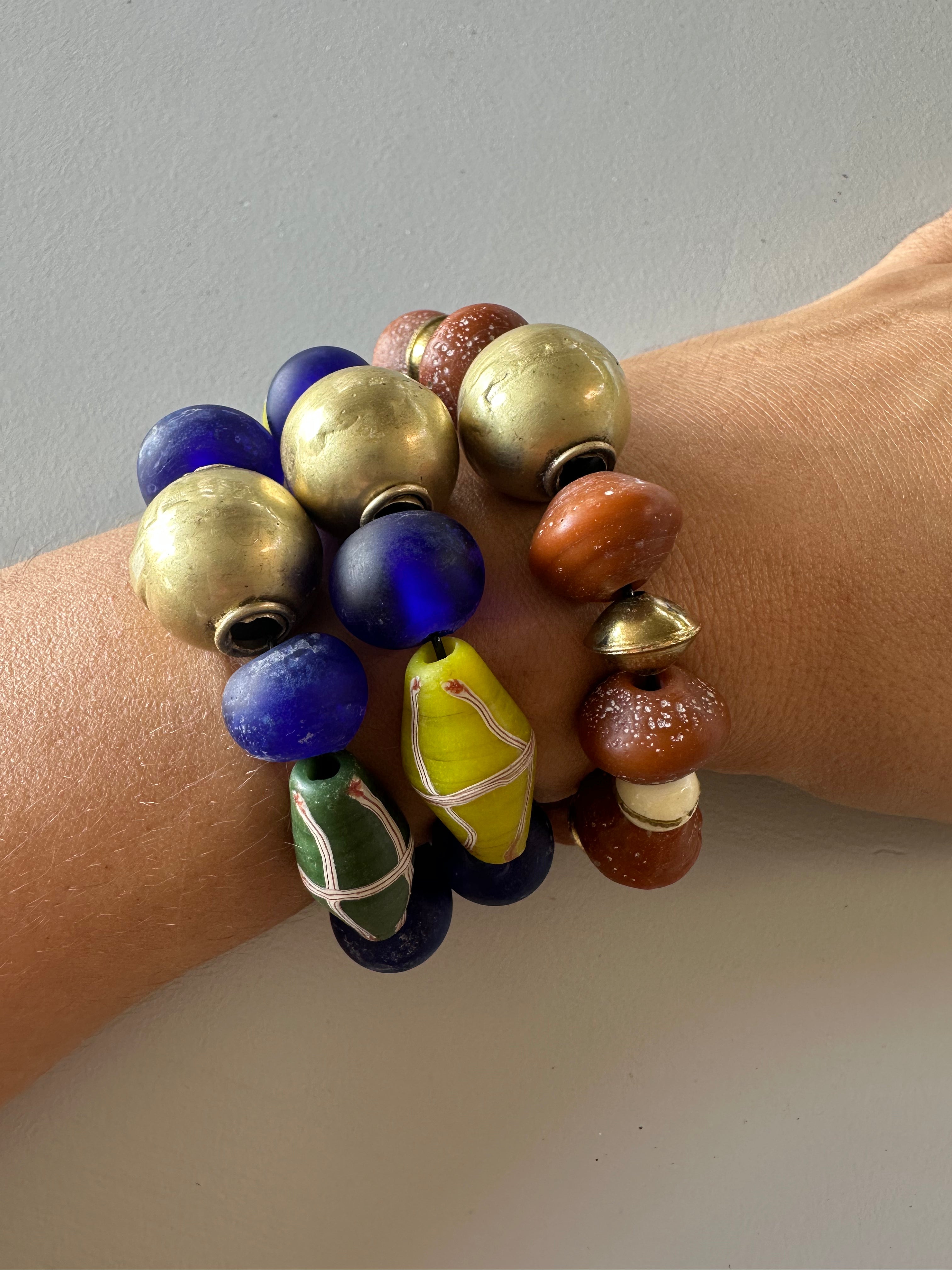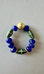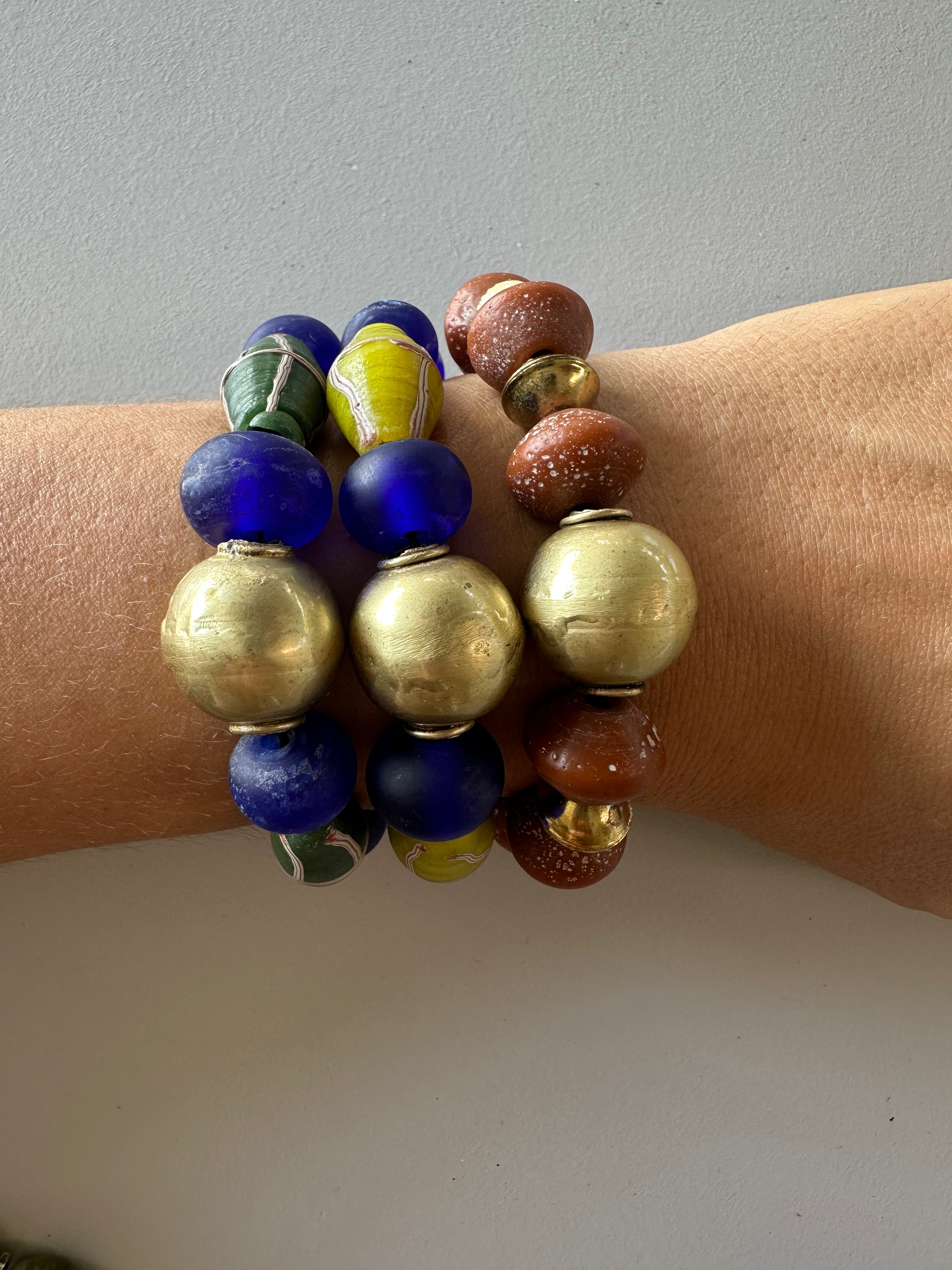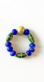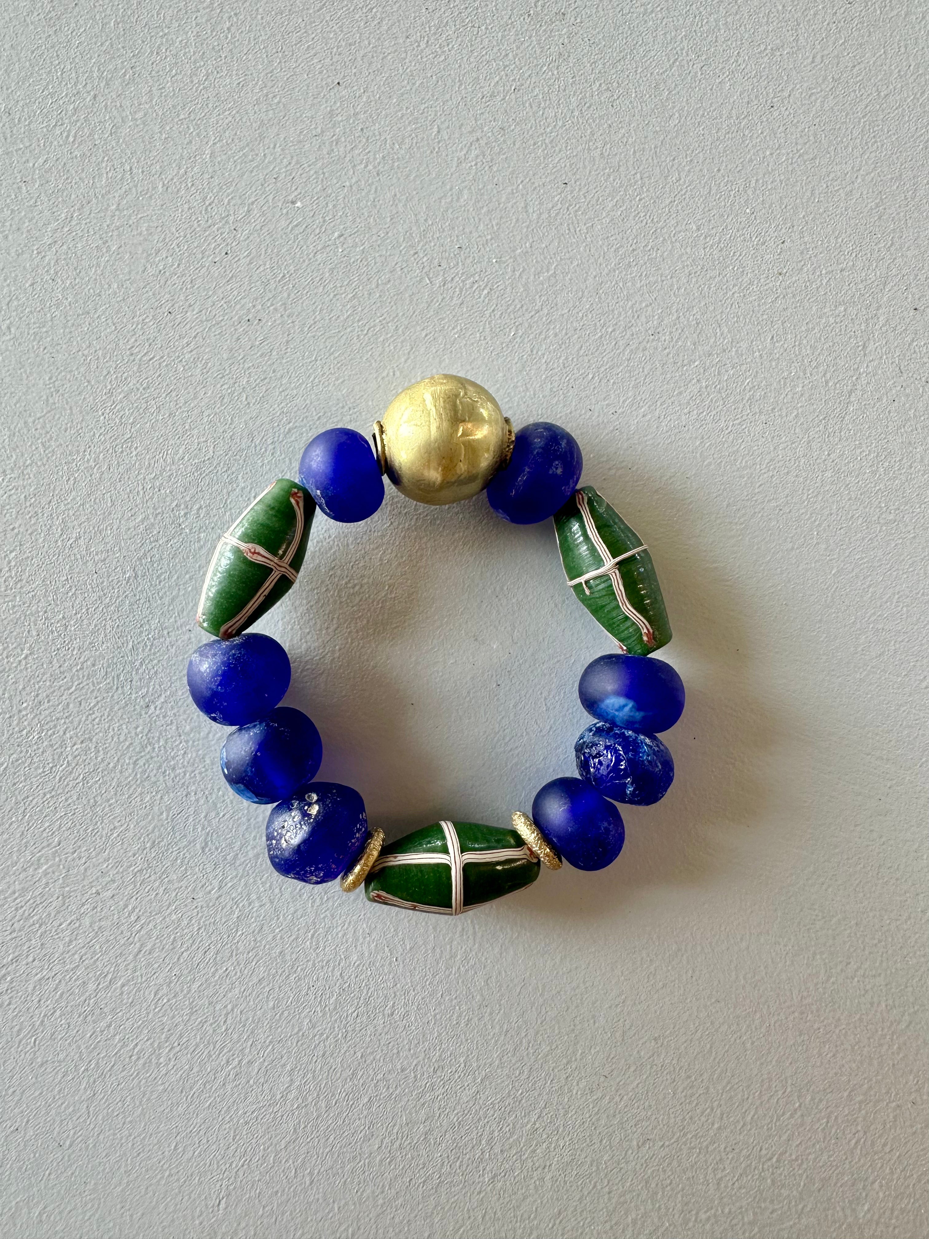 A very powerful bracelet with Ethiopian brass hero, recycled glass beads in parliament blue and French Cross java glass beads in dark green.