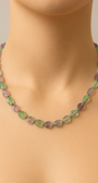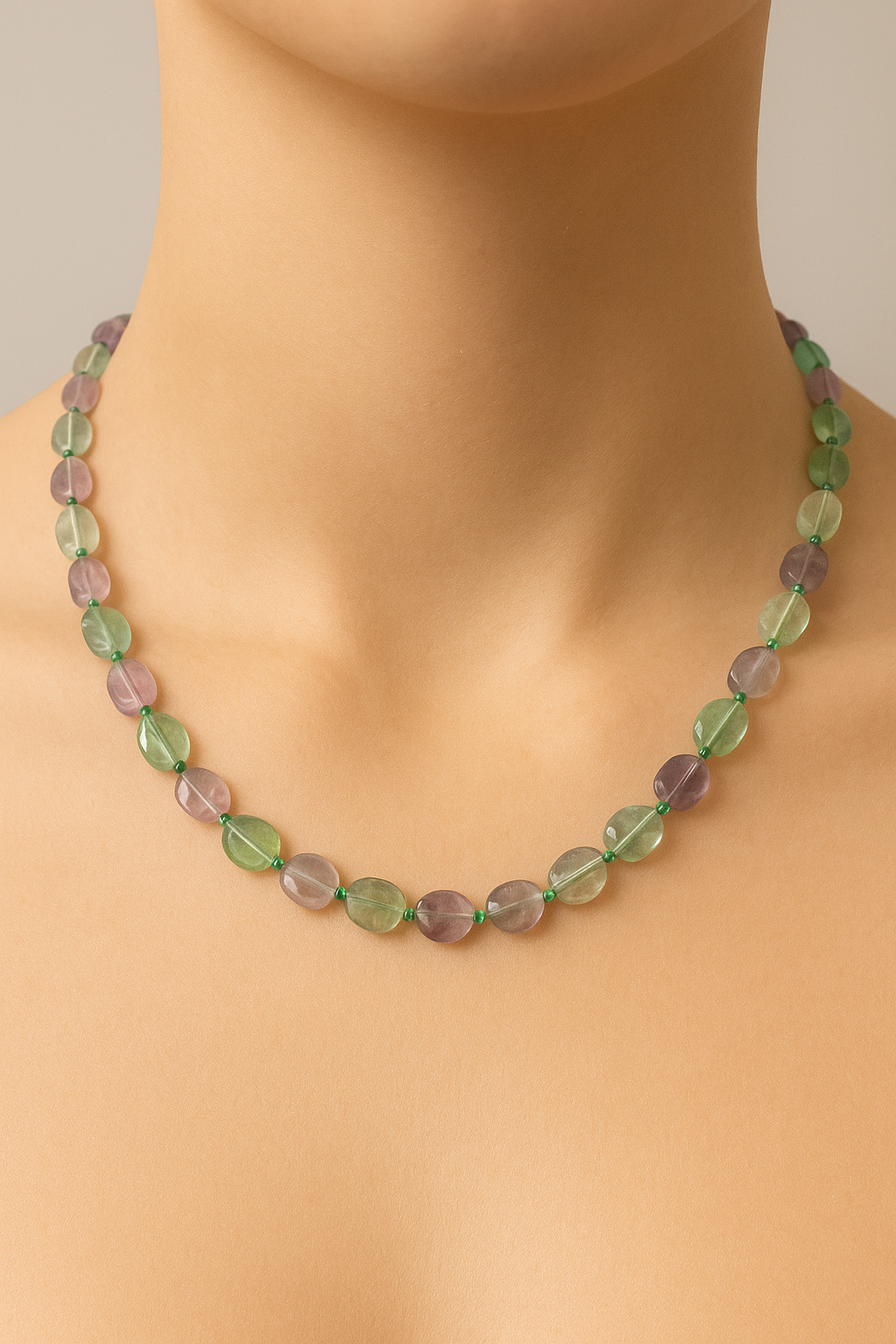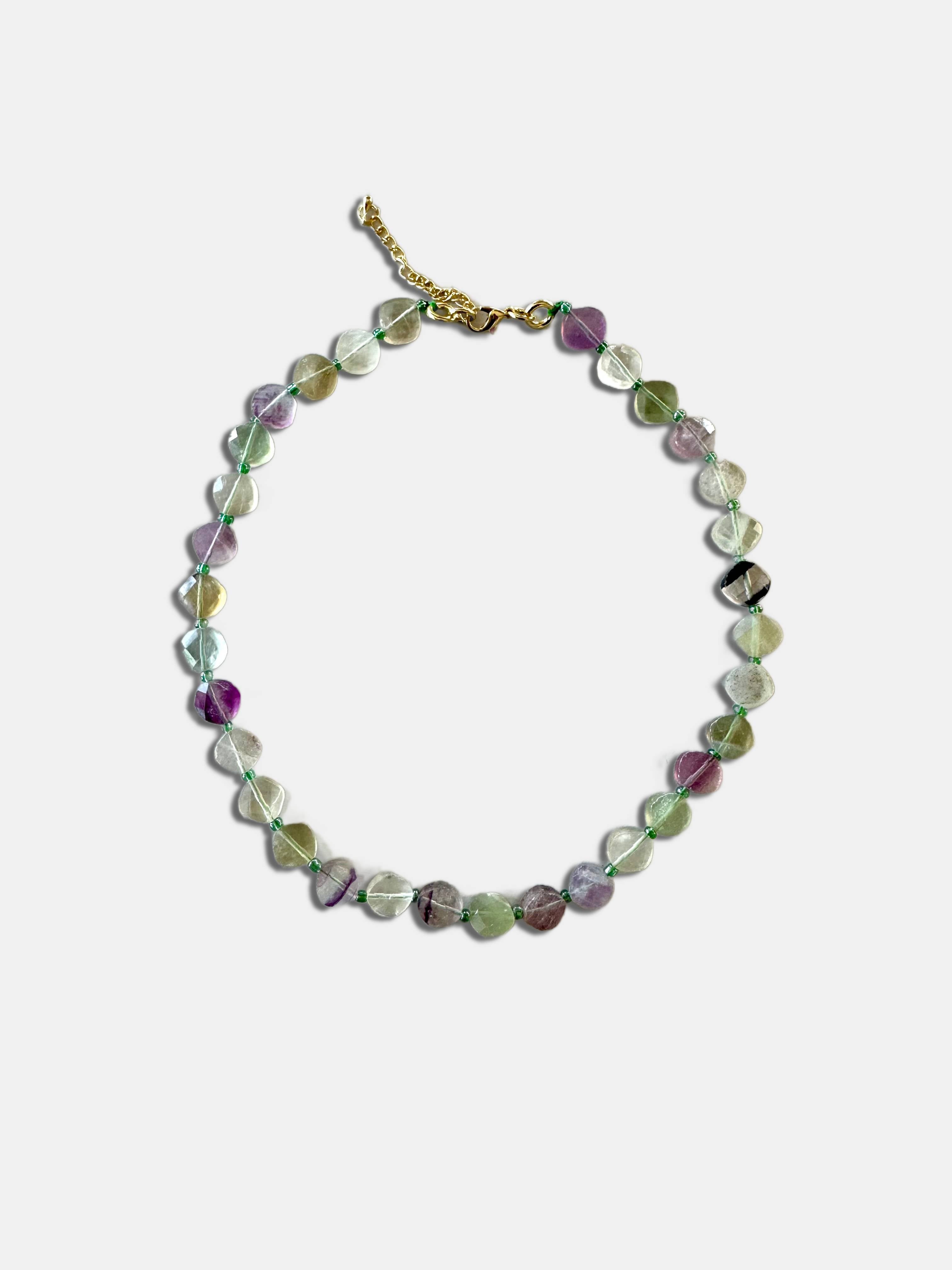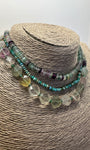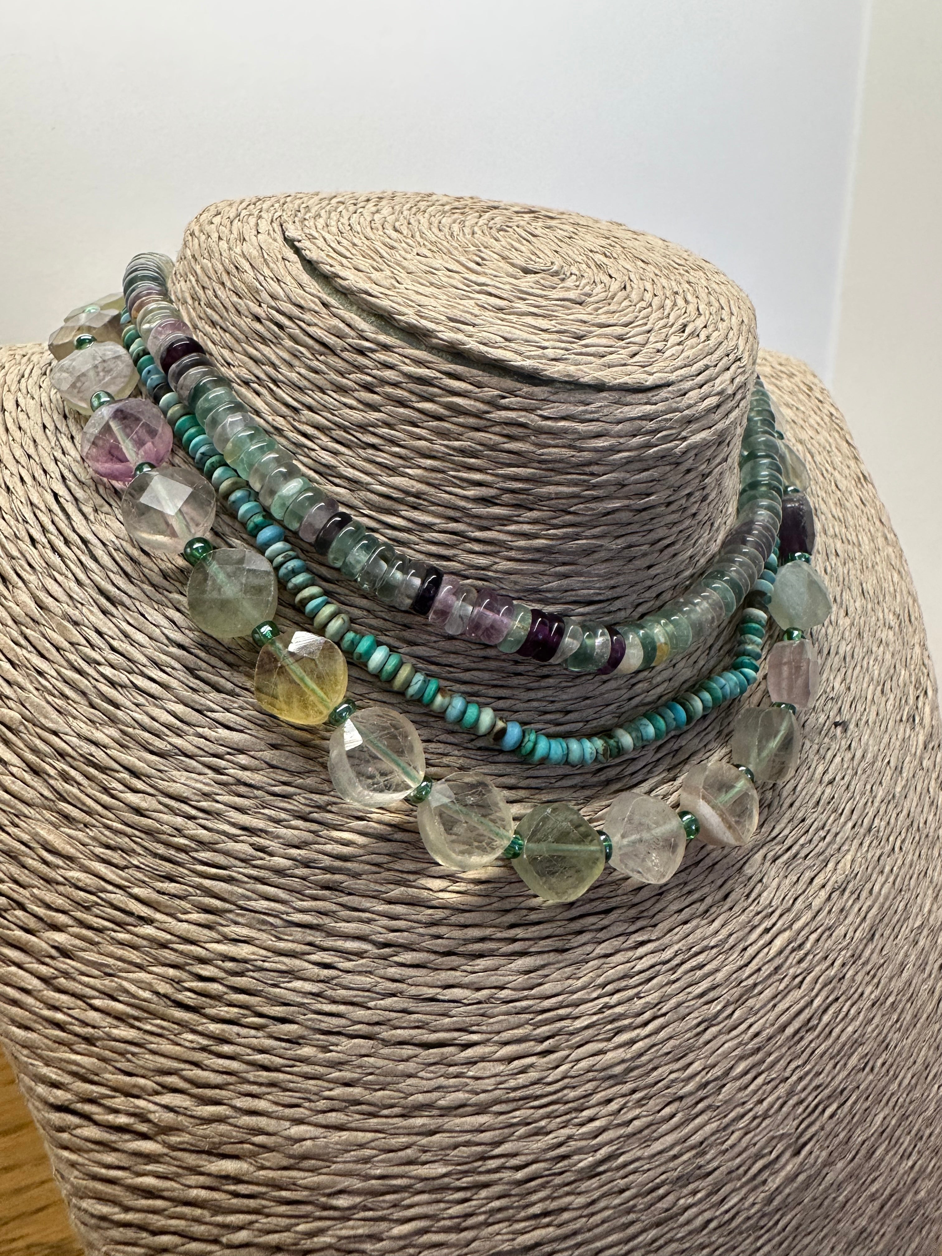 Flat fluorite stones medley with green spacers and a gold filled buckle and extender. Stones will vary since they are all natural stones. This also is a designer's favorite with its shine and light weight.