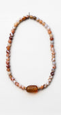 Ce collier à collerette est composé de pierres d'agate tibétaine mélangées marron clair et d'une perle de héros orange.