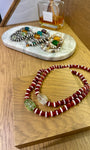 Ce collier à collerette est composé d'agates tibétaines rayées rouge/blanc et d'une perle de héros vert vif.