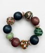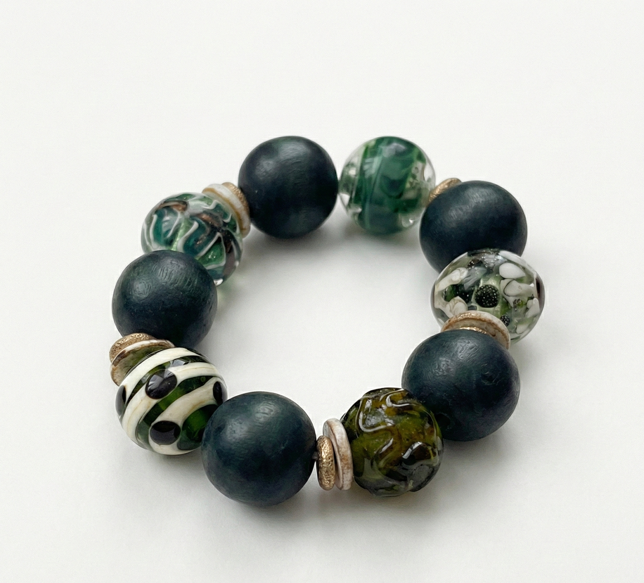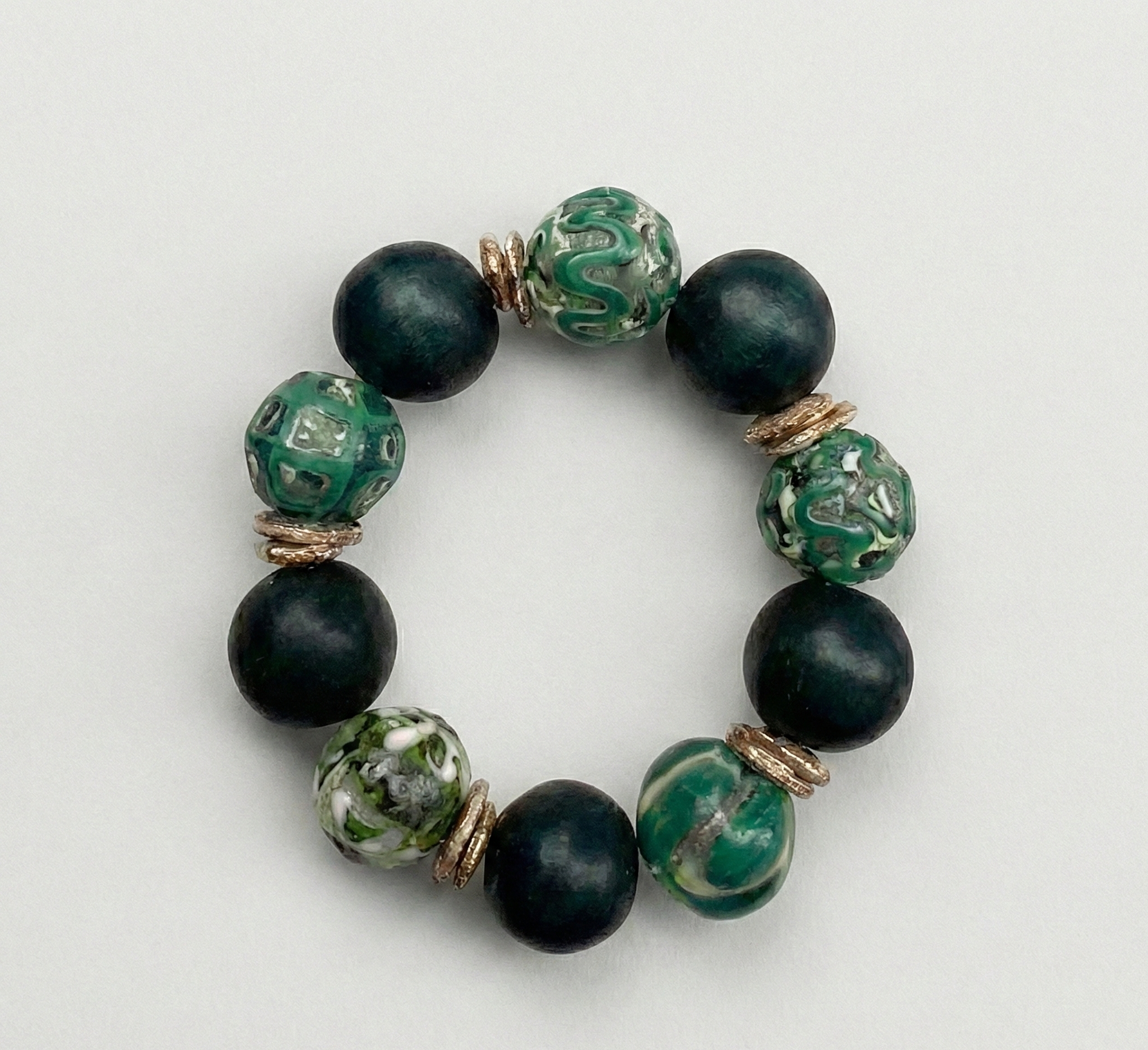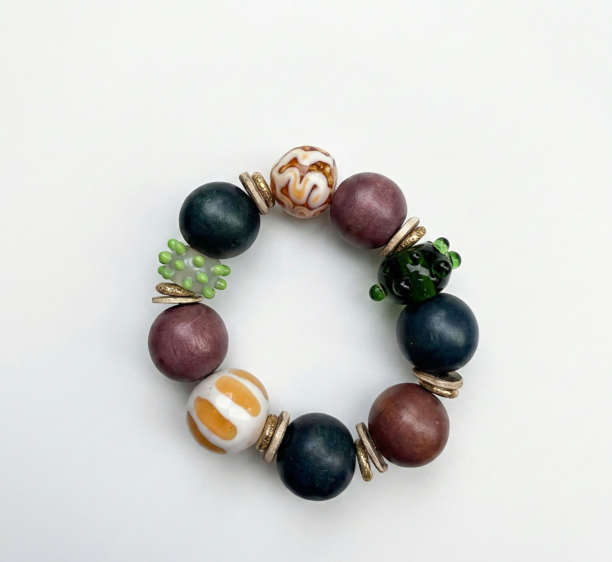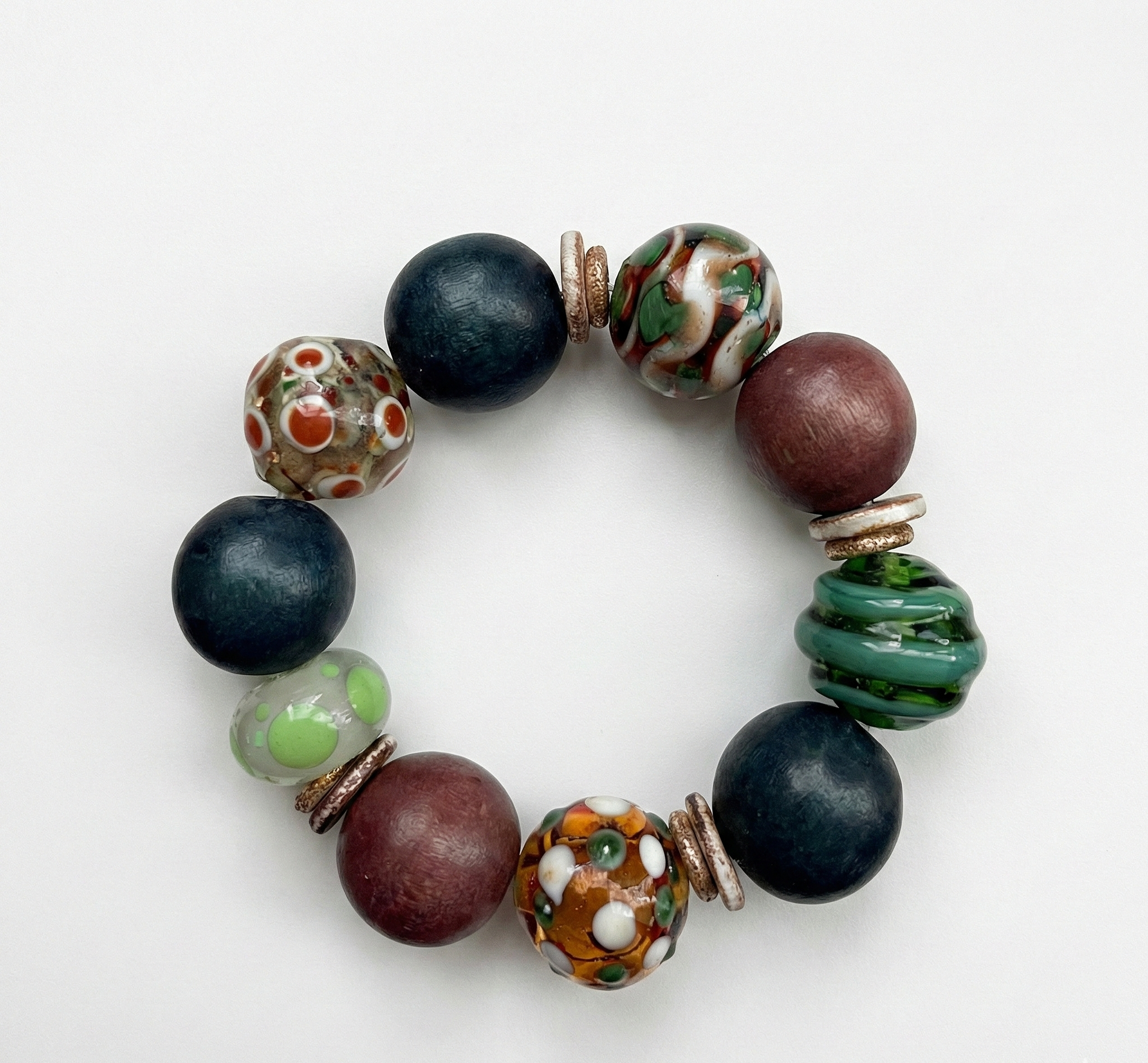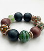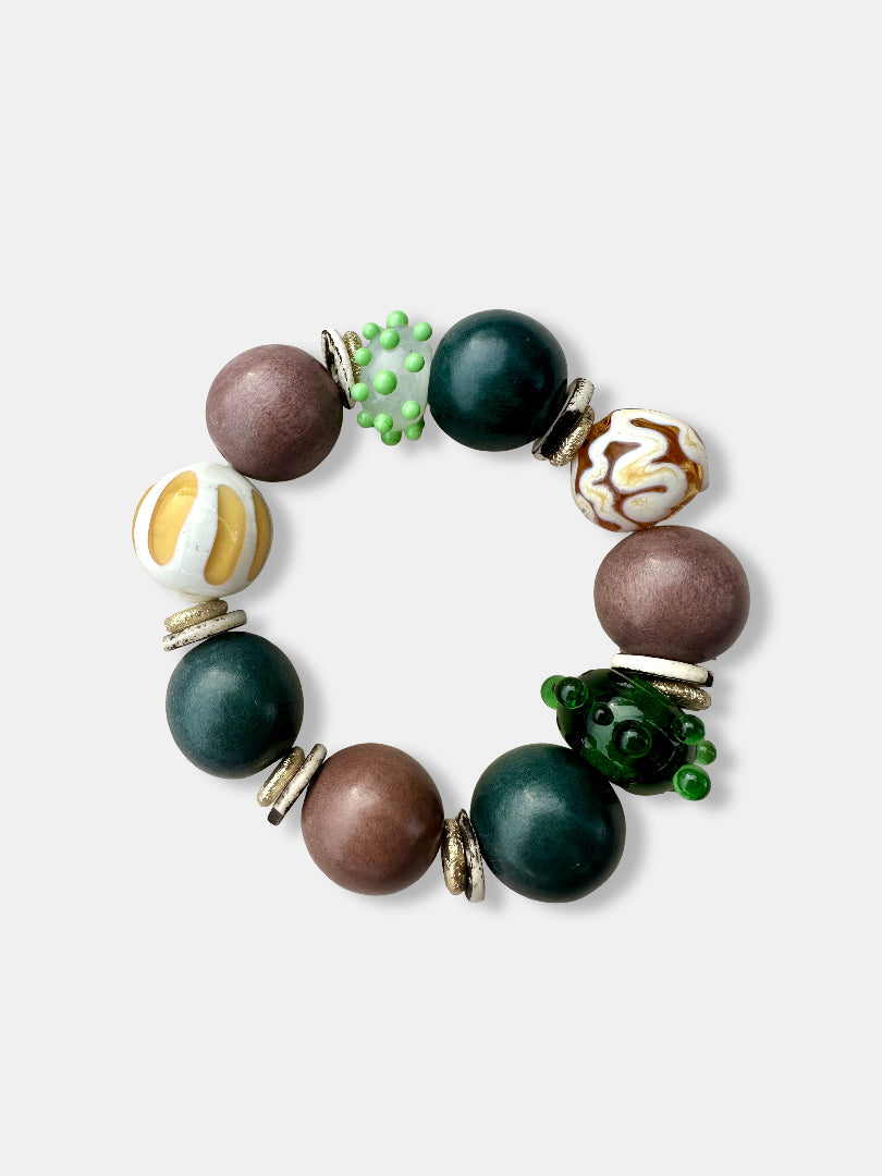 The Plume bracelet; last season's favorite that looks very powerful but weighs as light as a feather. Made fully with wooden beads and handmade Murano glass beads this summer, this is BiniBeca's new star.
