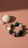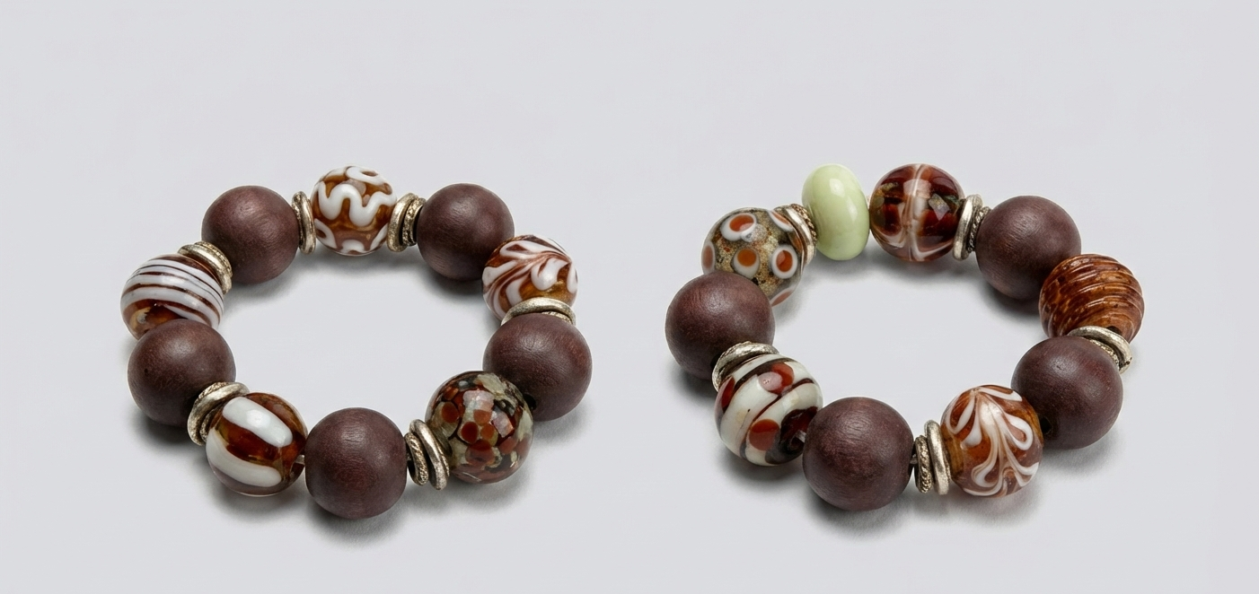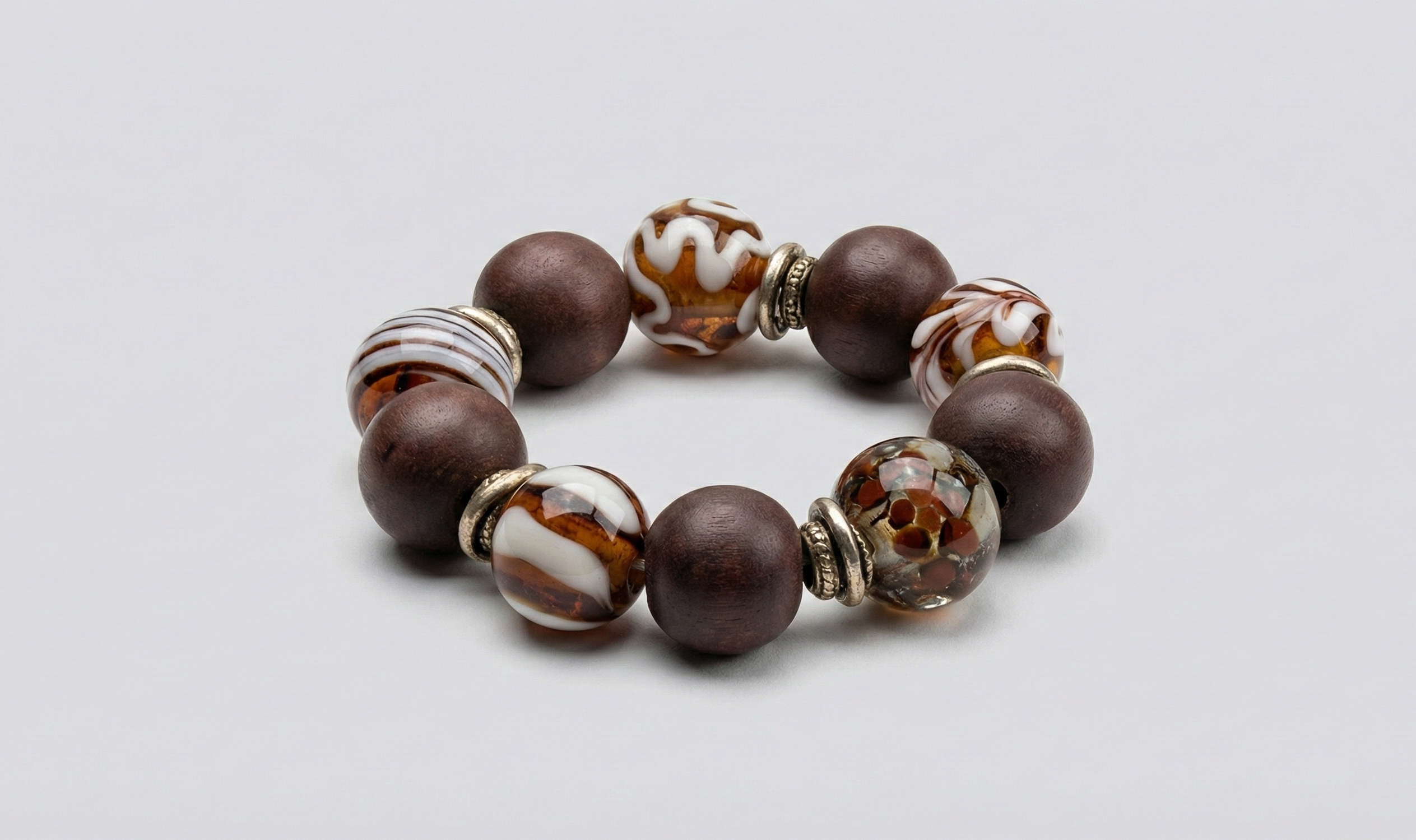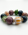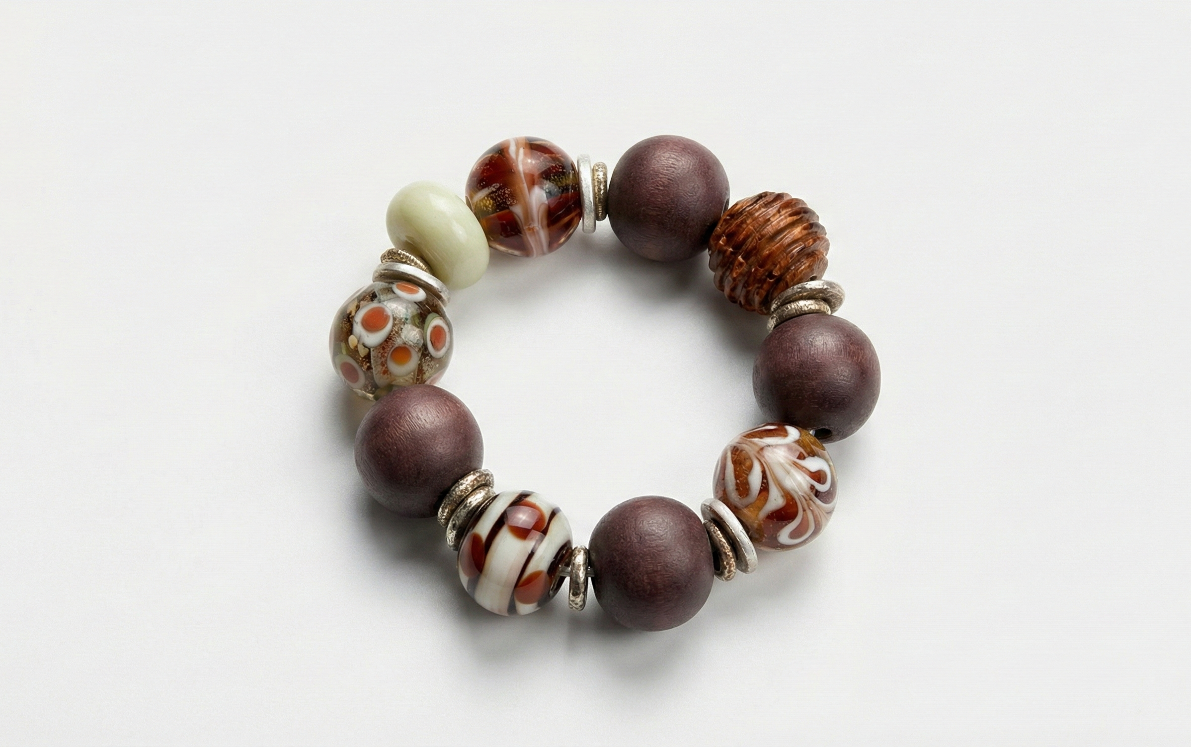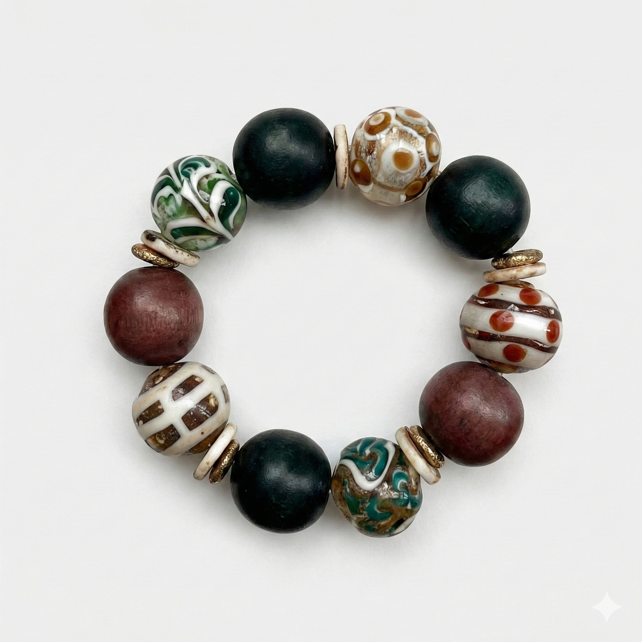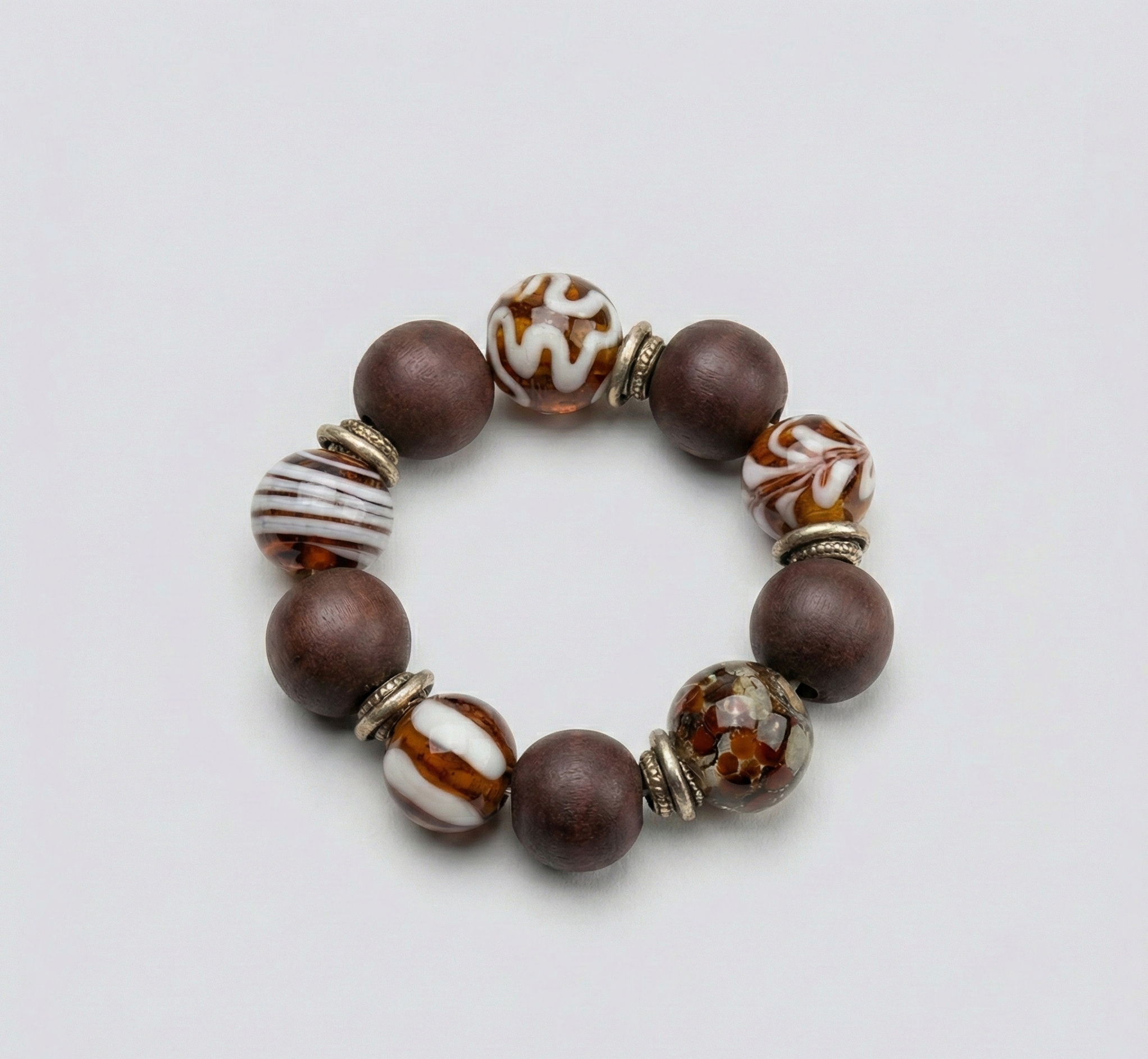 The Plume bracelet; last season's favorite that looks very powerful but weighs as light as a feather. Made fully with wooden beads and handmade Murano glass beads this summer, this is BiniBeca's new star.