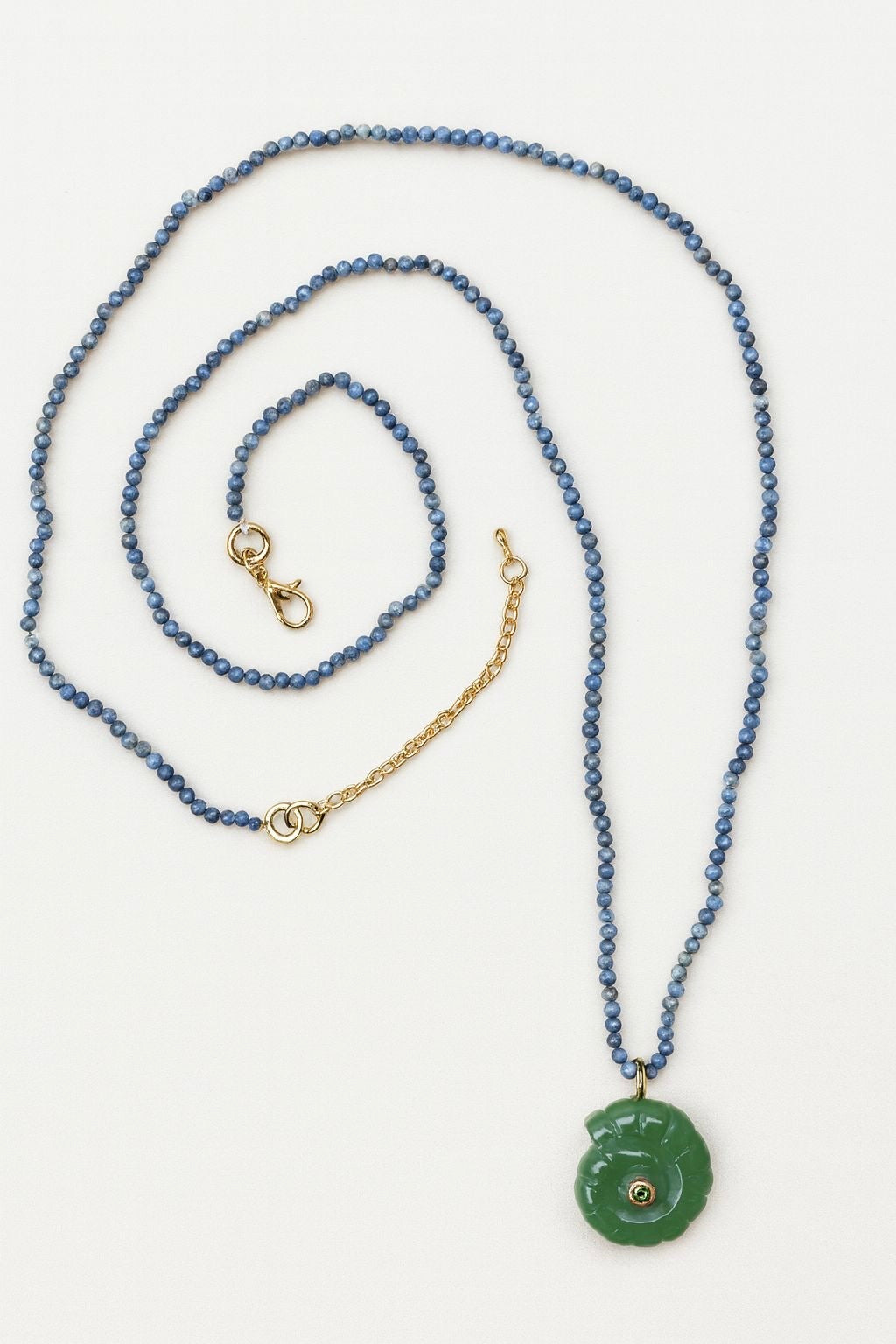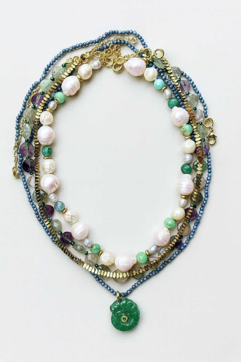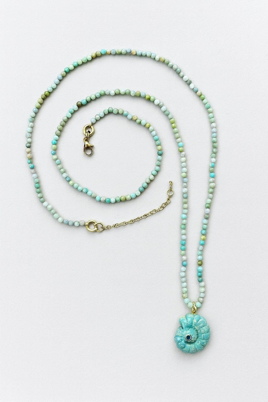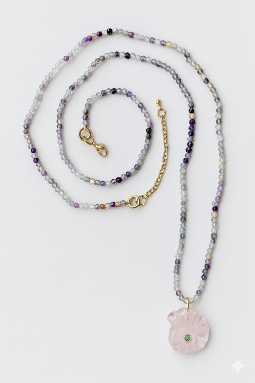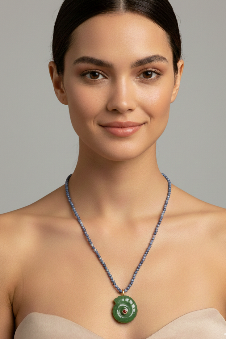 Bu uzun kolyede doğal taşlar ve ammonit şeklinde oyulmuş doğal taş bir pandantif bulunmaktadır. Bu ürün kesinlikle 2026'da en çok beğenilenler arasında yer alacak, şimdiden sizin olabilir:)