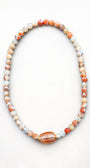 Bu kolye açık kahverengi karışık Tibet akik taşları ve turuncu Murano boncuğundan oluşuyor.