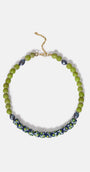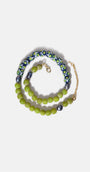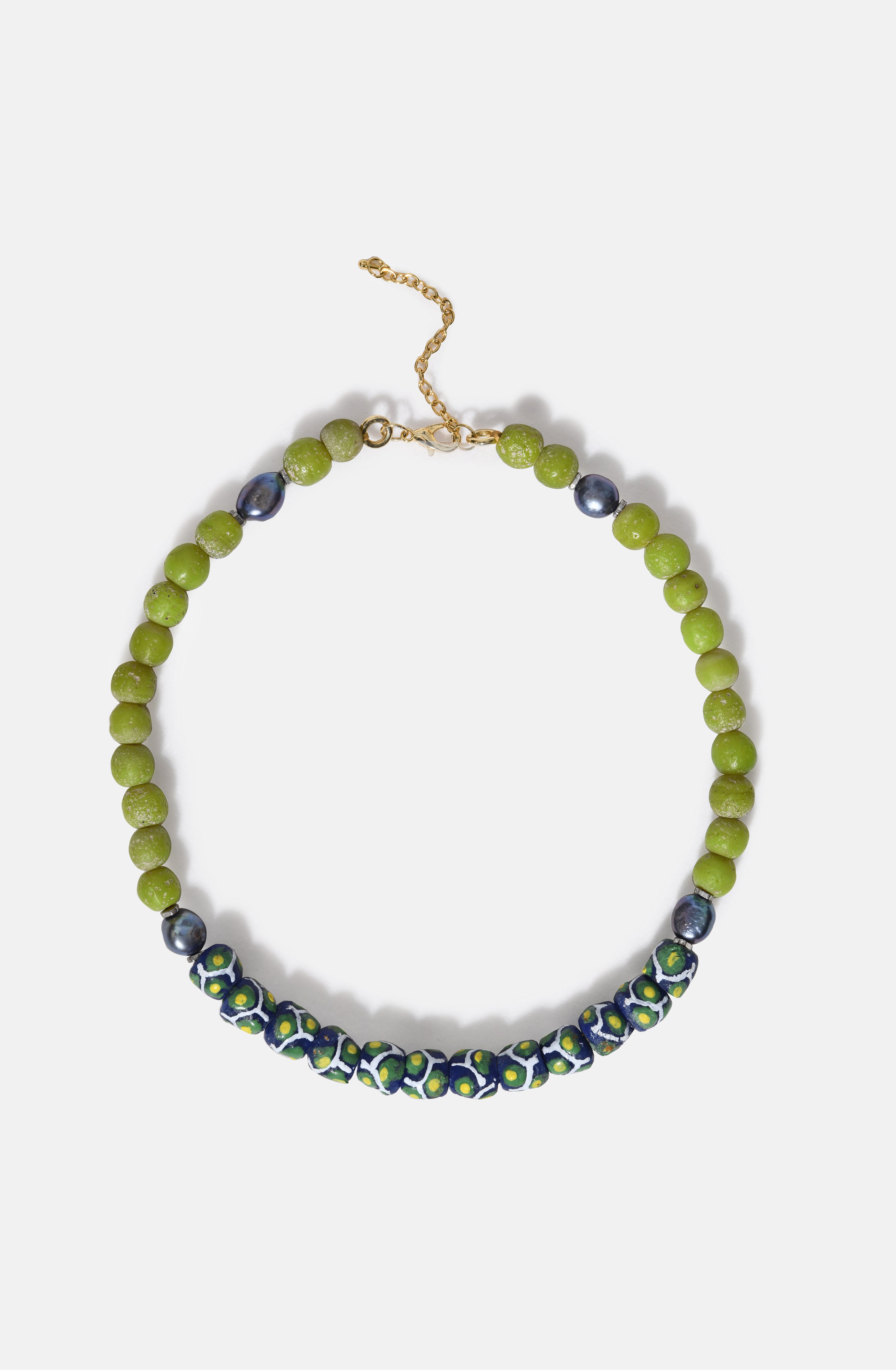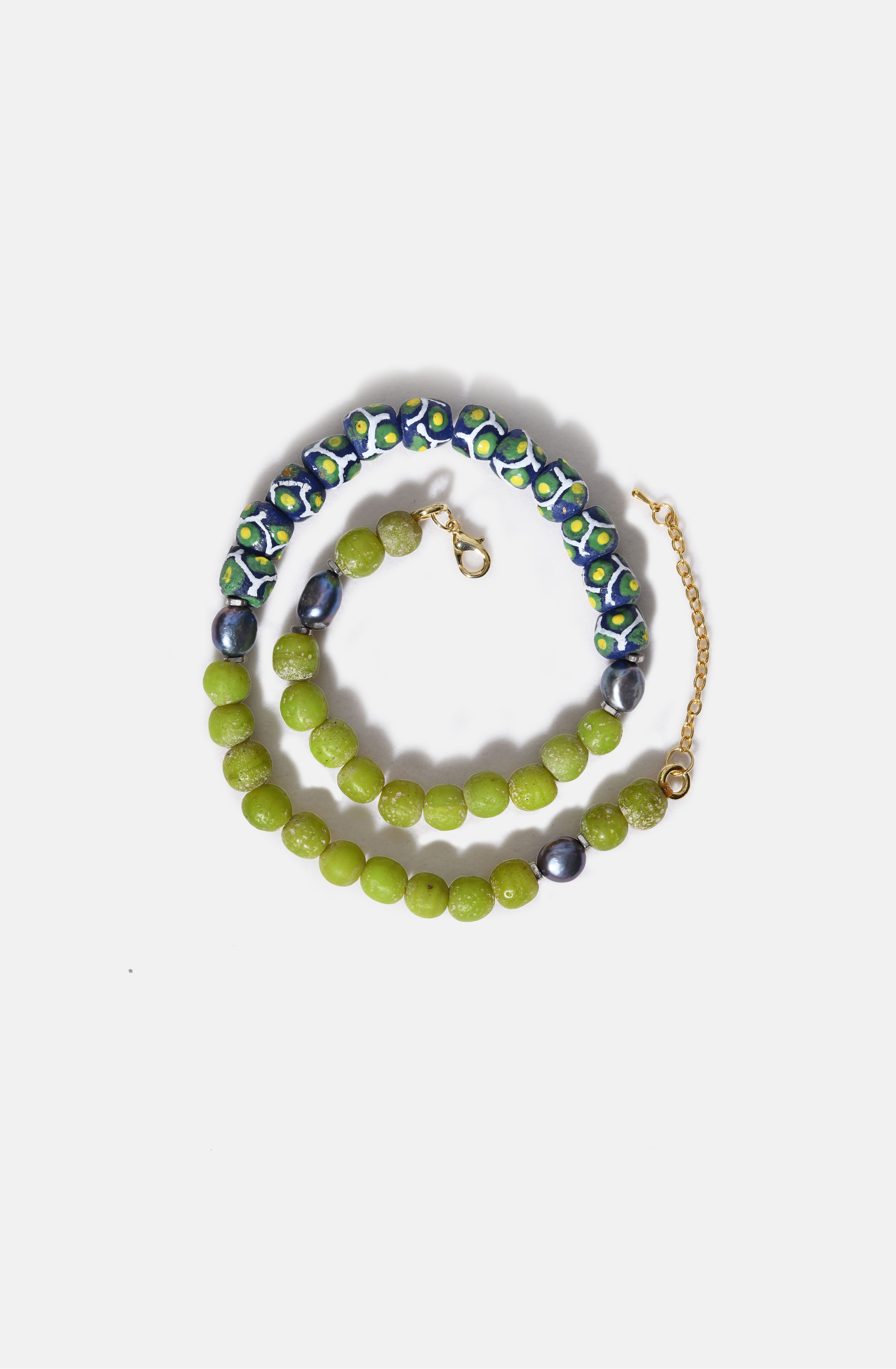 Bu çok şık ve uzun kolye, parlak yeşil geri dönüştürülmüş cam boncuklar ve çok koyu mavi kültür incileriyle oluşturulmuştur.